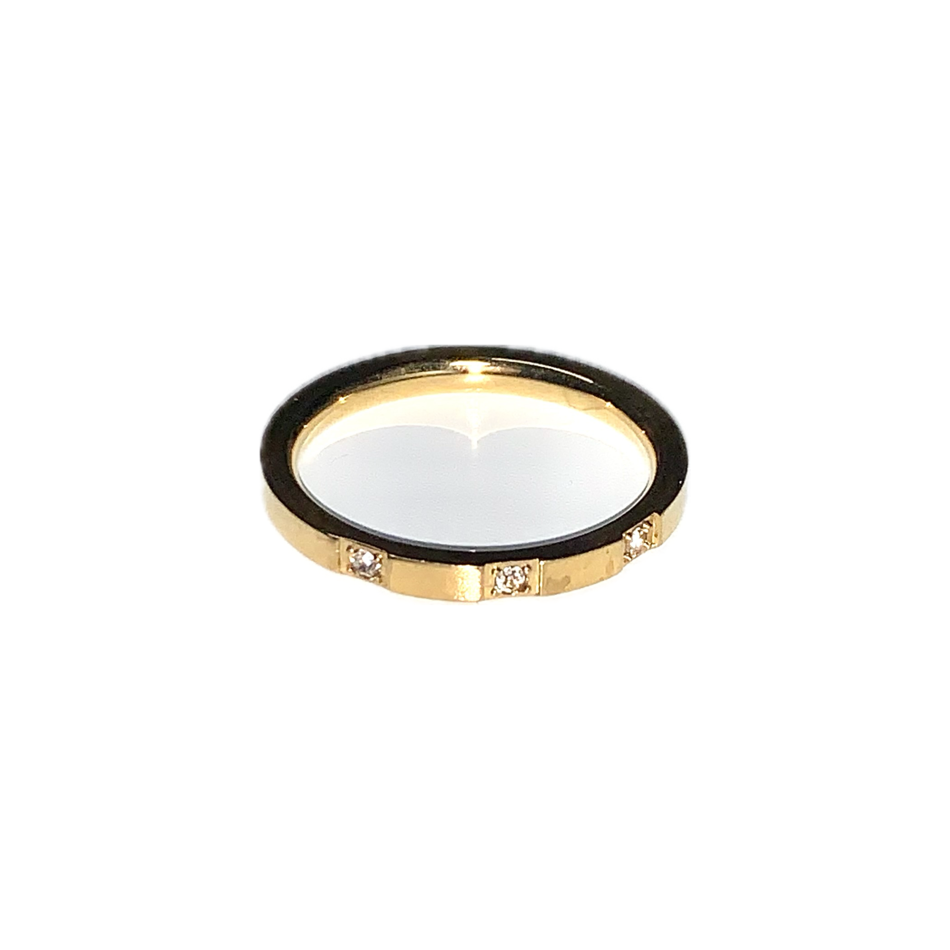 Anello oro acciaio inossidabile stile fedina con 3 zirconi nella superficie staccati l'uno dall'altro per circondare il dito di luminosità. Possibile regolarlo seconda della vostra esatta misura. Ha un design tutto ondulato e particolare una volta indossato .