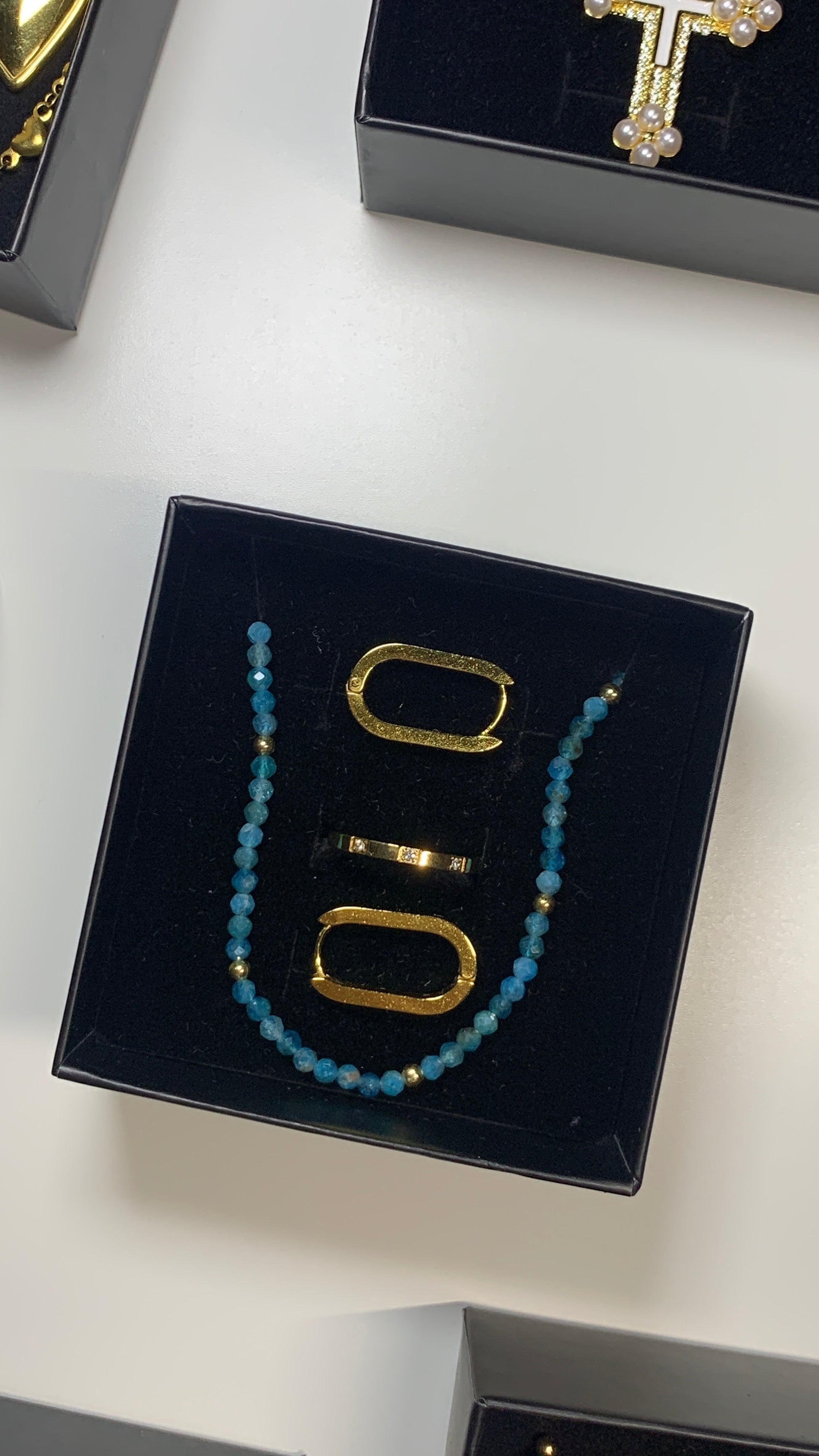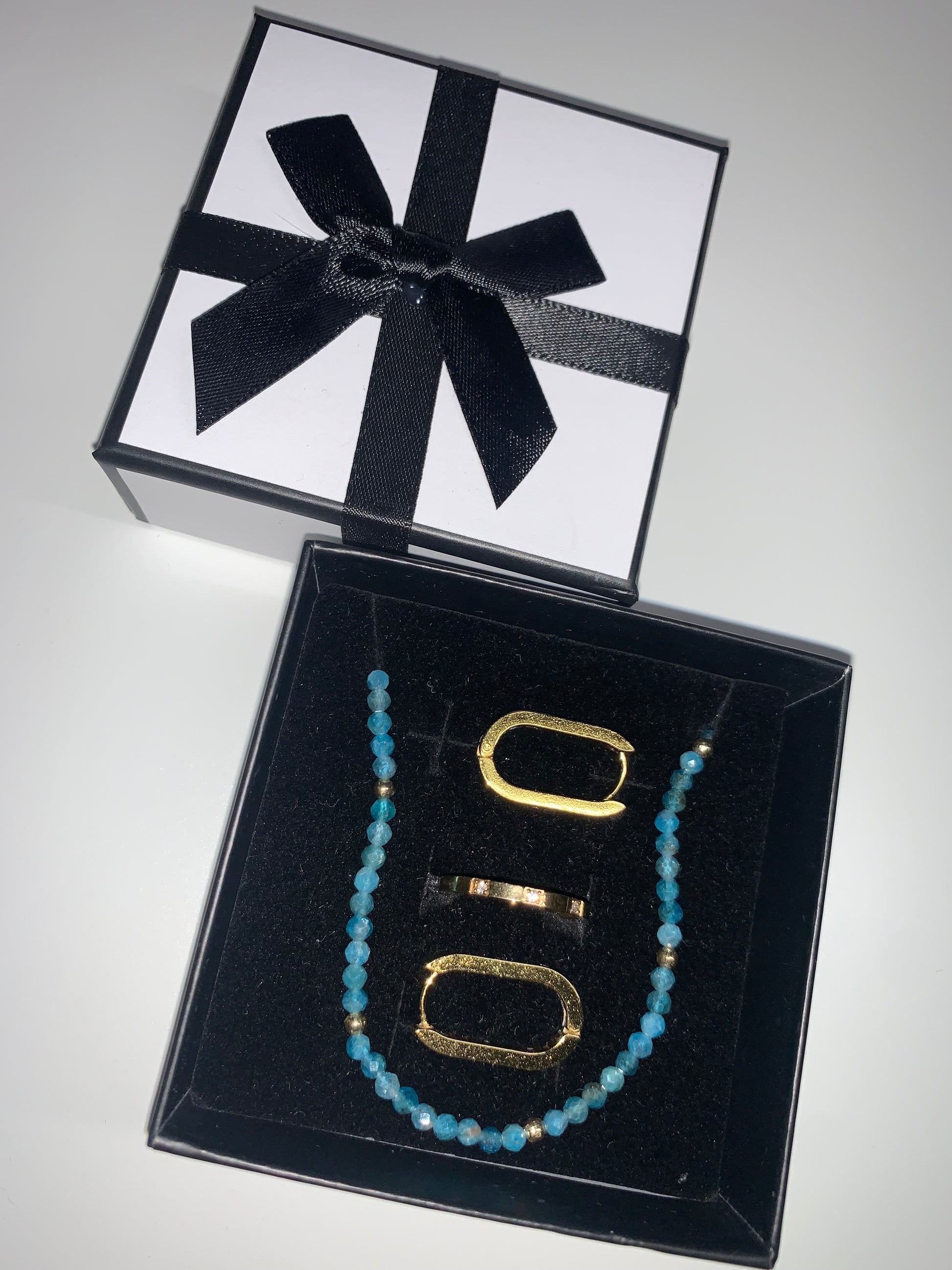 Un raffinato kit di gioielli in oro e azzurri composto da collana, anello e orecchini, pensato per donare luce e armonia ad ogni look.