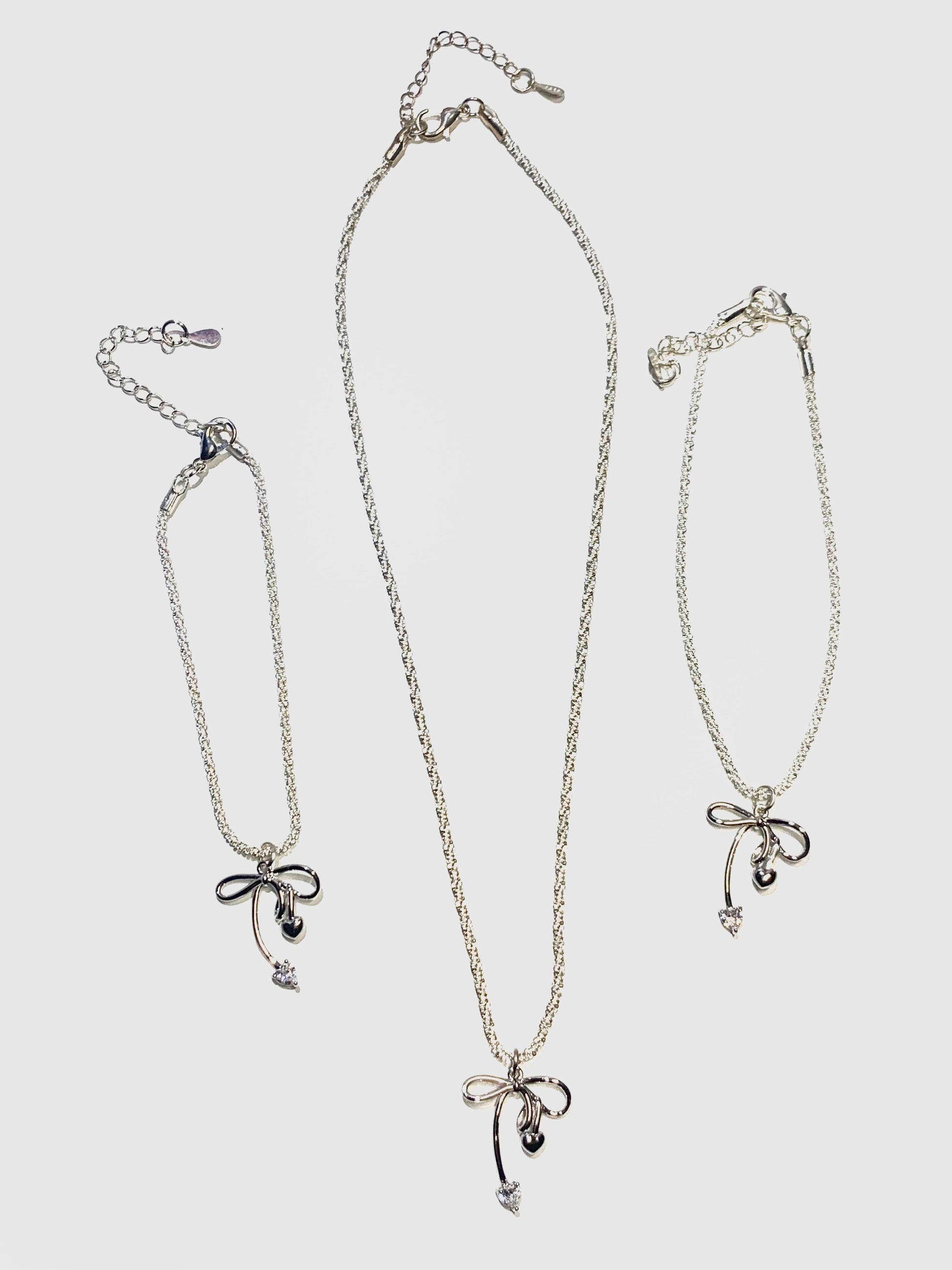 Set composto da 2 bracciali e 1 collana tutto Argento Sterling 925 con dettagli di un fiocco ciascuno impreziositi di cristallini sulla lunghezza a forma di cuore. Si tratta di una catena intrecciata lucidissima designer che si conclude con una catena pendente e la sua apposita chiusura in argento.
